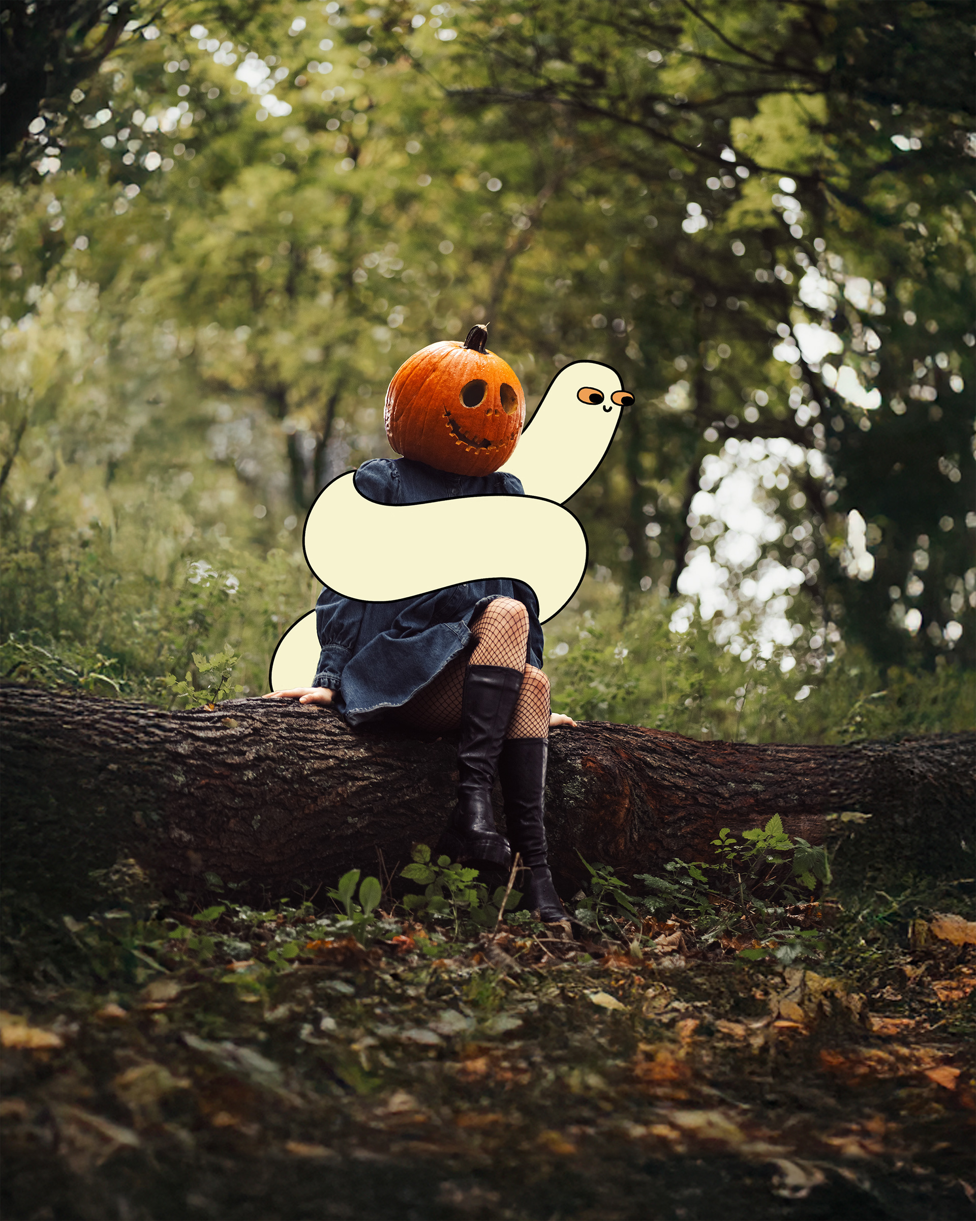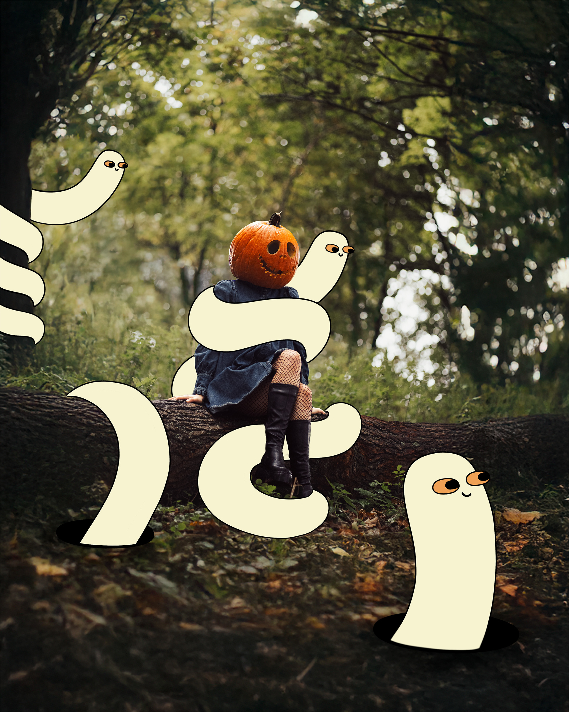 A fun experiment blending illustration and photography, featuring my worm characters and a collaborative photoshoot where I carved a pumpkin, put it on my head, and had a frolic in the woods.